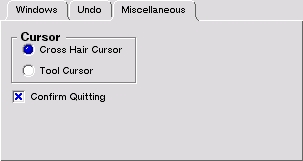 The cursor part controls how the mouse cursor appears when drawing on the image. If the 'Cross Hair Cursor' is selected, the cursor will look like a cross hair. If the 'Tool Cursor' is selected, the cursor will change depending on what painting-tool is in use. The checkbox 'Confirm Quitting' enables the boxes that ask you if you want to save the project when closing a window and the project has been changed since the last save. |