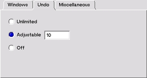 The checkboxes allow for changing between different window-modes. If a checkox is checked then the corresponding window will float above other windows of the app. Otherwise that window will behave just like a regular window. The second tab is for controlling the depth of undo mechanism and is labelled 'Undo'. The depth means how many operations can be backtracked in the best situation. This means that information for those operations is kept in memory. If it seems that there is too little memory for the program to operate with some image, it is advisable to lower the depth of the undo. Setting undo off frees quite a lot of memory, so it can be used in the emergency case when operating on some very big images. The 'Undo' tab is displayed in figure 2.