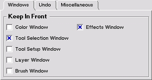 SettingsMost of the settings, like settings for tools, window positions, colors, etc. are saved automatically whenever the program is quit. There are also some settings that can be set through a settings window. These settings are also saved when the program is exited. The settings window allows for changing general options that affect how the program looks and behaves.The settings windowThe settings window has three tabs that each control different types of settings. The first tab is labelled 'Windows' and is picture in figure 1.